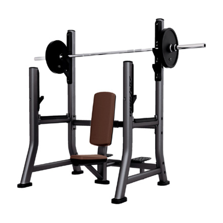 Life Fitness Olympic Military Bench er udstyret med en fast rygstøtte, der sikrer korrekt siddestilling og maksimerer effektiviteten af hver øvelse. Denne position understøtter en sikker udførelse, som er central for at opbygge stærke og veldefinerede skuldre.
